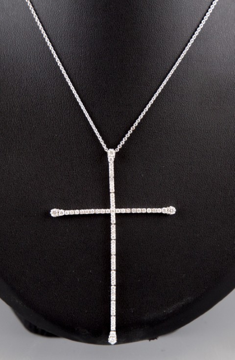 Estimation: 1000/1200 – Pendentif croix articulé en or blanc 18K 750°/°°, poinçon 750 et 18k, entièrement serti de diamants taille brillant pour un poids total d’environ 1ct et sa chaine