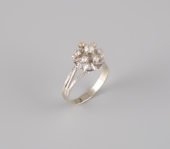 Estimation: 100/120 – Bague marguerite en or blanc 18k 750°/°°, poinçon tête d’aigle, sertie de pierres blanches