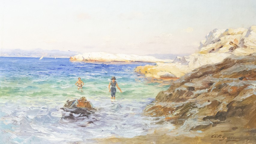 Estimation:400/600 Adolphe Louis GAUSSEN (1871-1954). « Baigneurs sur la Corniche, Marseille ». Huile sur toile signée en bas à droite. 32x54cm. Expert : Cabinet Chanoit, Paris.