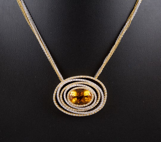 Estimation: 2850/2950 – Collier multichaine en or bicolore 18k 750°/°°, poinçon 750, et son pendentif central ovale serti d’une citrine de Madère d’environ 5,10ct et d’un pavage de diamants
