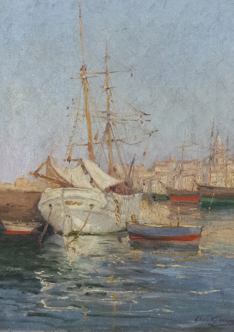 Estimation:600/800 Adolphe Louis GAUSSEN (1871-1954). « Bateau au port, Notre dame des Accoules, Marseille ». Huile sur toile signée en bas à droite. 41x33cm. Expert : Cabinet Chanoit, Paris.