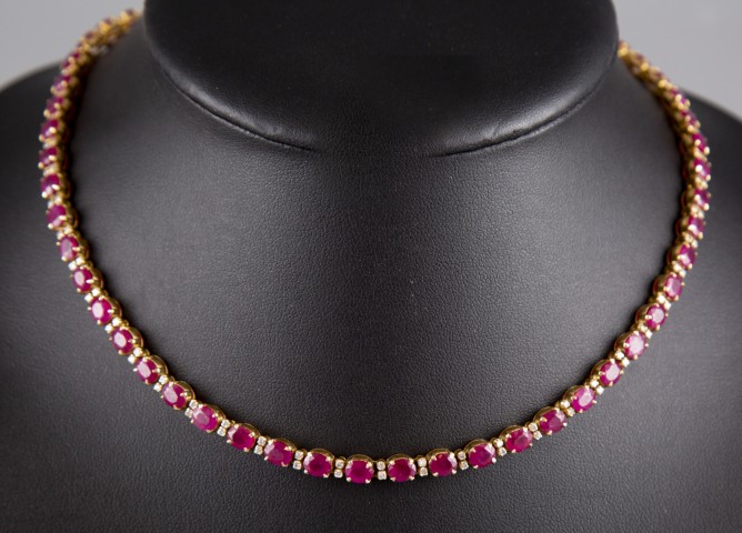Estimation: 3200/4000 – Collier articulé en or jaune 18K 750°/°°, poinçon 750, serti de 56 rubis pour un poids total d’environ 28cts alternés de diamants taille brillant pour un total d’environ 1ct