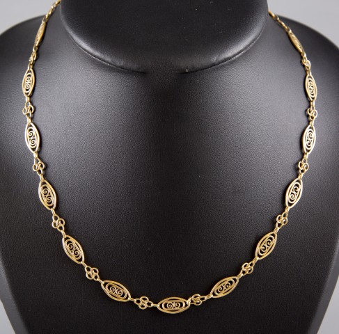 Estimation: 1000/1200 – Sautoir en or jaune 18K 750°/°°, poinçon tête d’aigle, à mailles filigrannées
