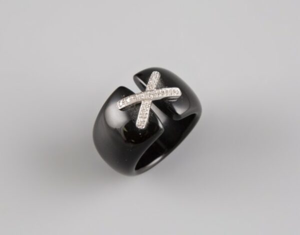 Estimation: 300/400 – Bague jonc en jade noir et or blanc 18k 750°/°°, poinçon 750, le motif central formant une croix dans le goût de Chaumet serti de diamants taille 8/8