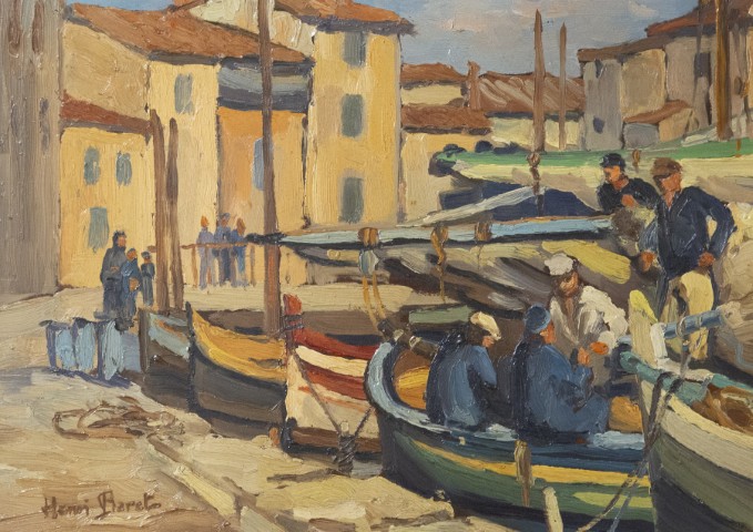 Estimation:150/200 Henri BARET (XX°). « Les pécheurs ». Huile sur panneau, signée en bas à gauche. 32,5x45cm.
