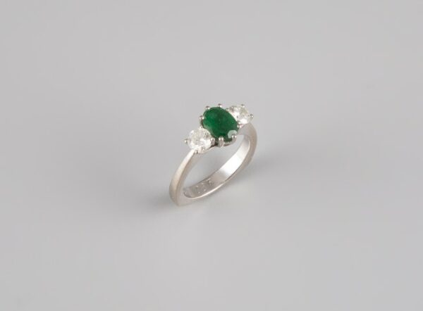 Estimation: 600/800 – Bague en or blanc 18k 750°/°°, poinçon 750, sertie d’une émeraude centrale de forme ovale, entourée de diamants taille brillant