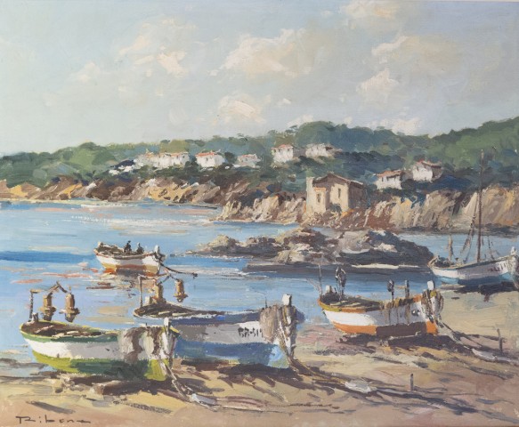 Estimation:80/100 Ecole française du XXème. « Pointus sur la plage ». Huile sur toile portant une signature non déchiffrée en bas à gauche. 53x65cm.