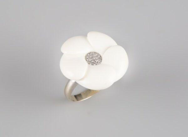Estimation: 200/300 – Bague de style Camélia en or blanc 20K 820°/°°, poinçon hibou, surmontée d’une fleur en résine sertie en son centre de brillants