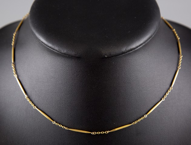 Estimation:350/400 Giletière en or jaune 18K 750°/°°, poinçon tête d’aigle, à maille forcat alternée de parties rigides. Longueur 39cm. Poids 7,90g.