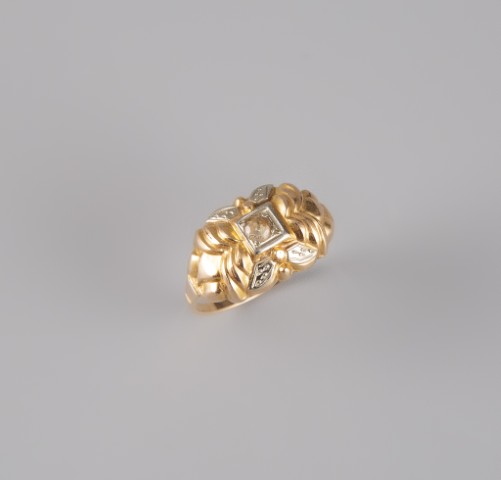 Estimation: 80/100 – Bague rétro en or jaune 18k 750°/°°, poinçon tête d’aigle, sertie en son centre d’une pierre blanche