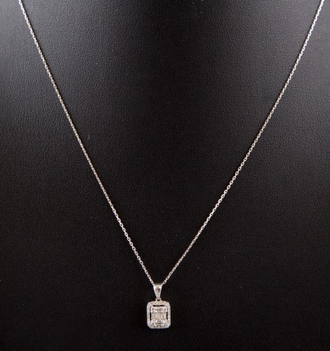Estimation:150 / 250 Collier en or blanc 18K 750°/°° retenant un pendentif rectangulaire serti de diamants baguettes et brillants pour un total d’environ 0,30ct.