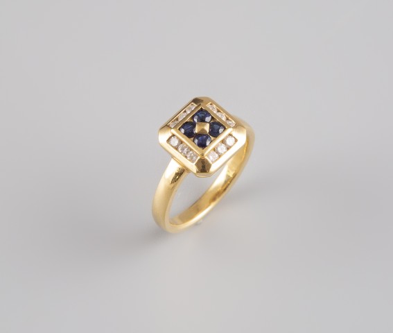 Estimation: 600/900 – Bague en or jaune 18k 750°/°°, poinçon tête d’aigle, plateau carré serti de saphirs (env