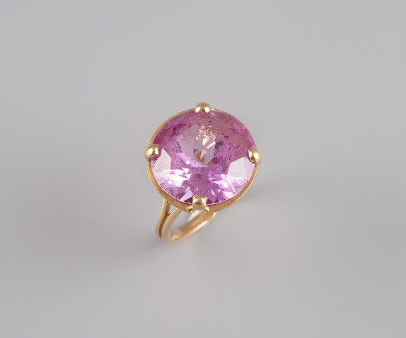 Estimation: 300/400 – Bague en or jaune 18k 750°/°°, poinçon hibou, sertie d’un pierre rose de forme ronde