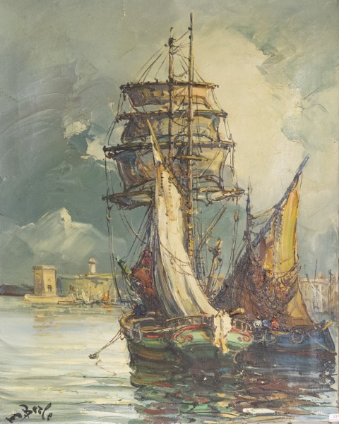 Estimation:150/200 Maurice BARLE (1903 – 1961). « Voiliers dans l’avant port de Marseille ». Huile sur toile signée en bas à gauche. 73x54cm