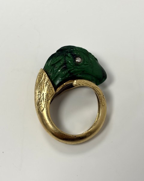 Estimation: 500/700 – Bague perroquet en or jaune 18k 750°/°°, poinçon tête d’aigle, la partie supérieure en pierre verte taillée et sertie de brillants dans les yeux