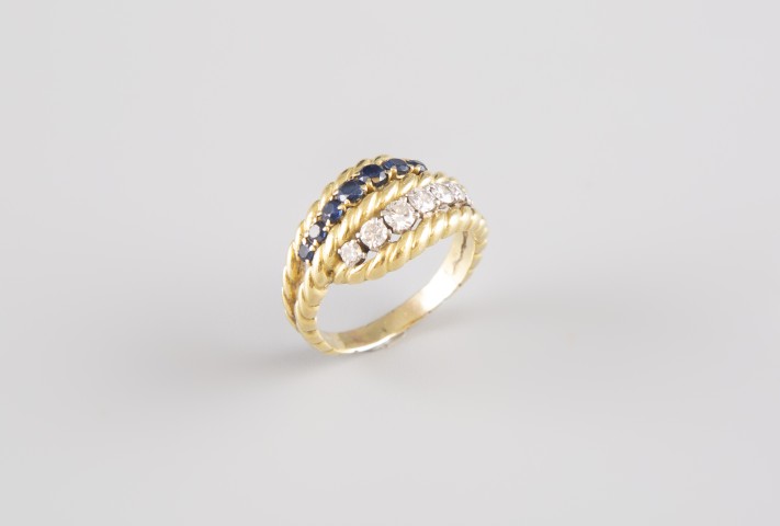 Estimation: 500/700 – Bague en or jaune 18 K 750°°, sertie de deux lignes, l’une de diamants taille brillant, l’autre de saphirs calibrés