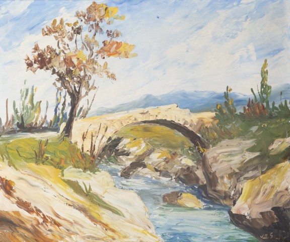 Estimation:80/100 Ecole française du XXème. « Le pont romain du plan de la Tour ». Huile sur toile portant une signature indéchiffrable en bas à droite.54x65cm.