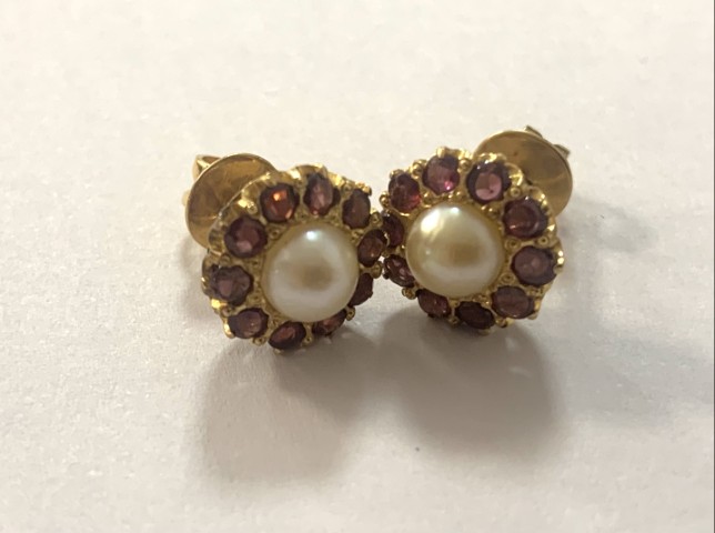 Estimation: 80/100 – Paire de puces d’oreille en or jaune serties de perles et de grenat