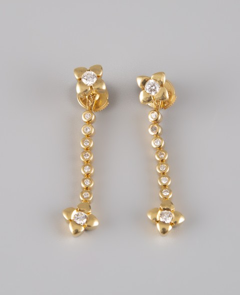 Estimation: 1000/1200 – Paire de pendants d’oreille en or jaune 18k 750°/°°, poinçons tête d’aigle et 750, et diamants, pouvant se transformer en puces d’oreilles