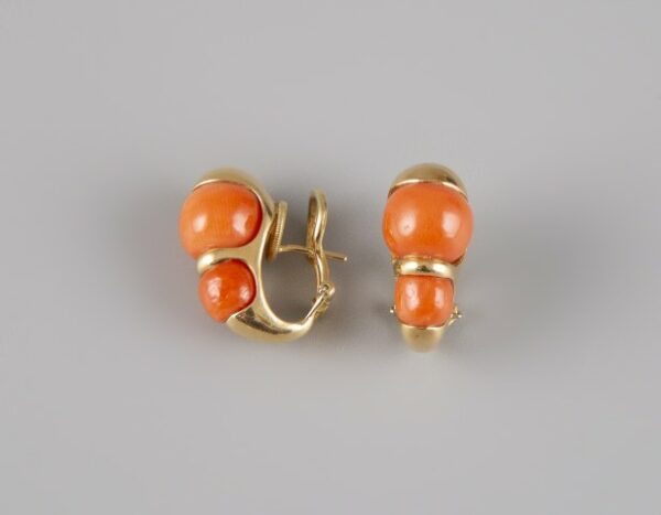 Estimation: 1000/1200 – Paire de boucles d’oreille en or jaune 18k 750°/°°, poinçon effacé, ornées de boules de corail