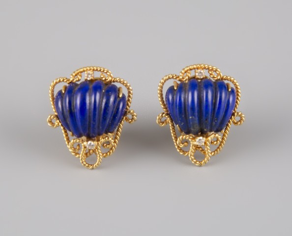 Estimation: 600/800 – Clips d’oreille en or jaune 18k 750°/°°, poinçon tête d’aigle, ornés de cabochons de lapis lazuli