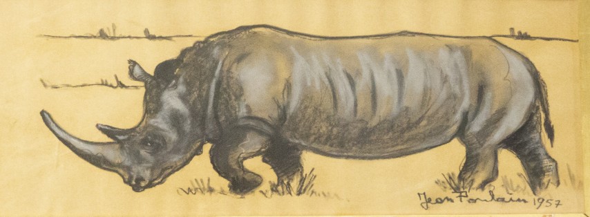 Estimation:200/300 Jean POULAIN (1864-1967). « Rhinocéros ». Technique mixte, fusain, signée en bas droite et datée 1957. 30x60cm.