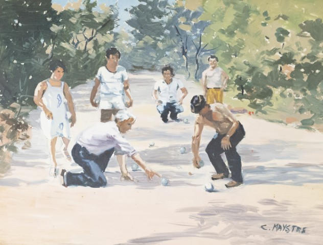Estimation:80/100 Casimir MAYSTRE (XX). » La partie de pétanque ». Huile sur toile signée en bas à droite. 50,5x85cm.