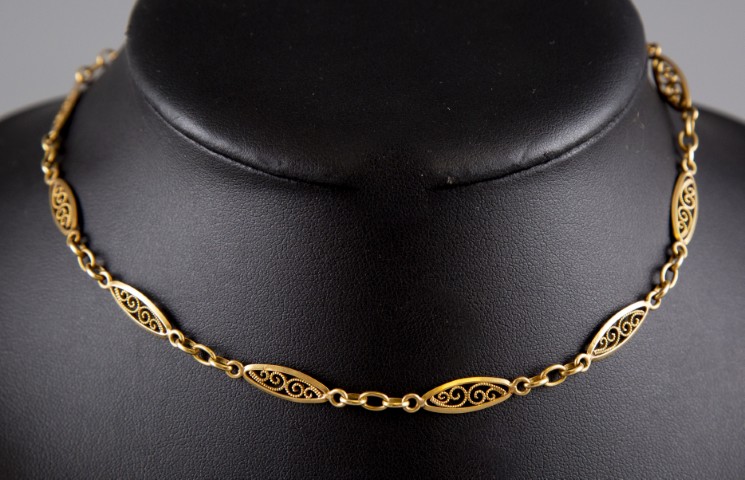 Estimation:500/600 Giletière en or jaune 18K 750°/°°, poinçon tête d’aigle, à maille filigranné. Longueur 35cm. Poids 11,42g.