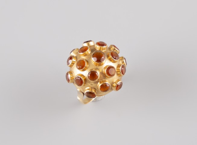 Estimation:300/400 Bague boule en or jaune 18K 750°/°°, poinçon 750 et hibou, sertie de citrines. Tour de doigt 50. Poids 4,8g