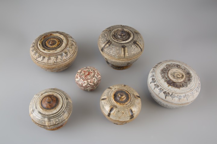 Estimation:400/600 THAILANDE, Sawankalok – XVe siècle. Ensemble de six pots couverts en grès émaillé gris et bleu, et vert et rouge à décor de fleurs et motifs stylisés.