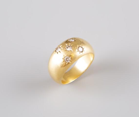 Estimation: 1900/2000 – Bague jonc en or jaune 18K 750°/°°, poinçon tête d’aigle, sertie de cinq diamants taille brillants