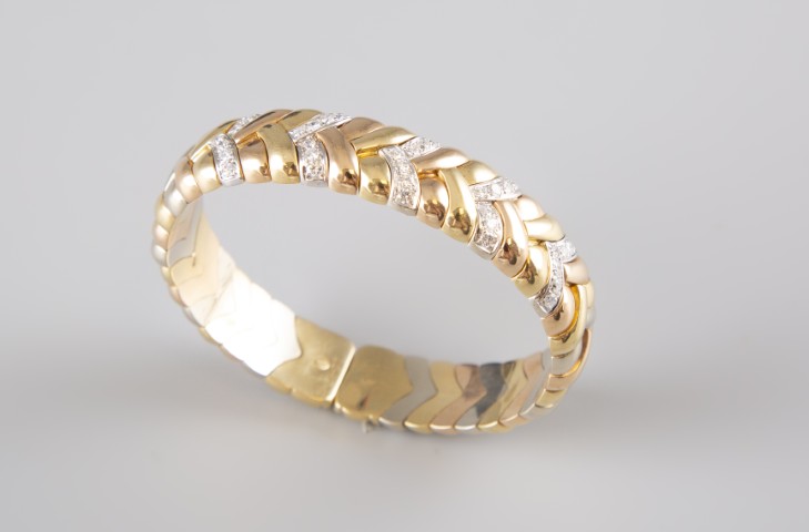 Estimation:5200/5500 LIZHEL. Bracelet rigide en or tricolore 18k 750°/°°, poinçon 750, alterné de motifs tressés les uns dans les autres dont certains pavés de brillants. Diamètre 16cm. Poids brut 71,63g.
