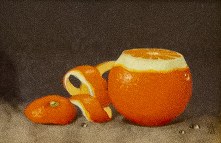 Estimation:150/200 André DOROGUINE (XX°) « Orange ». Huile sur panneau signée en bas à droite. 11×16,5cm.
