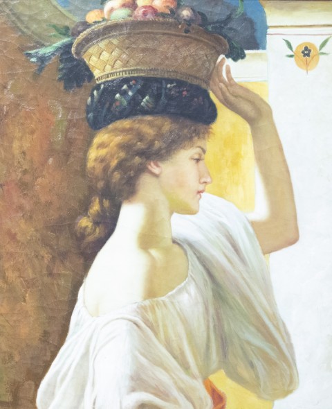 Estimation:300/400 Ecole française, début XX°. » Jeune fille portant un panier de fruits ». Huile sur panneau. 60,5×50 cm. Cadre en bois doré moderne.