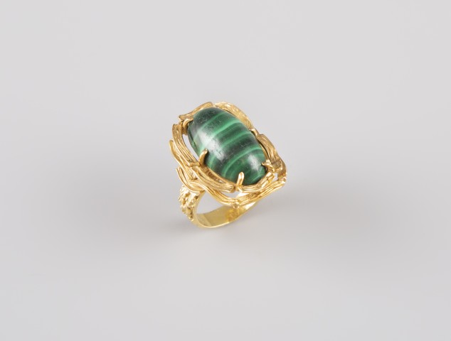 Estimation:300/400 Bague en or jaune 18k 750°/°°, poinçon hibou, sertie en son centre d’un cabochon de malachite. Tour de doigt 53. Poids brut 13,30g.
