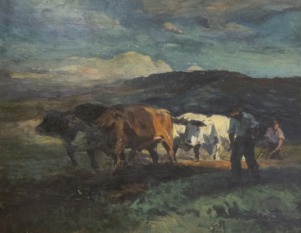 Estimation:300/400 Claude Honoré HUGREL (1880-1944). « Scene de Labour » Huile sur carton, signée en bas à droite. 71,5×91,5cm.
