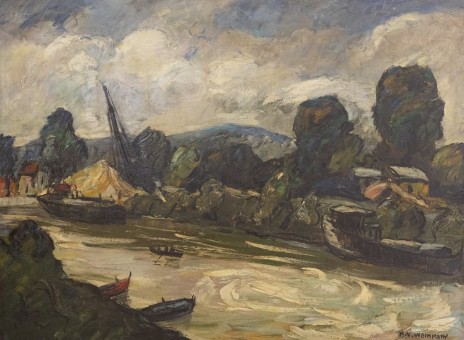 Estimation:200/300 Nandor VAGH WEINMANN (1897-1978). « Vue d’un fleuve ». Huile sur toile signée en bas à droite.60,5×81,5cm.