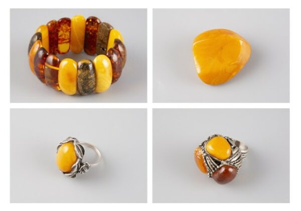 Estimation: 80/100 – Lot de bijoux en ambre comprenant 4 pièces dont : un bracelet élastiqués avec ambre de différentes couleur, une bague en argent sertie de trois pierres d’ambre, une bague argent et cabochon d’ambre, une broche en ambre