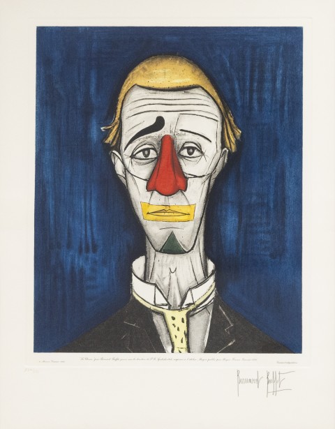 Estimation:600/800 Bernard BUFFET (1928-1999). « Le clown ». Gravure d’interprétation, à l’aquatinte, sur papier, signée en bas à droite et numérotée 174/275 en bas à gauche au crayon par l’artiste. Edition MAGUI, copyright Maurice Garnier, 1986. Cuvette 47x38cm, Papier, A vue 65x50cm.