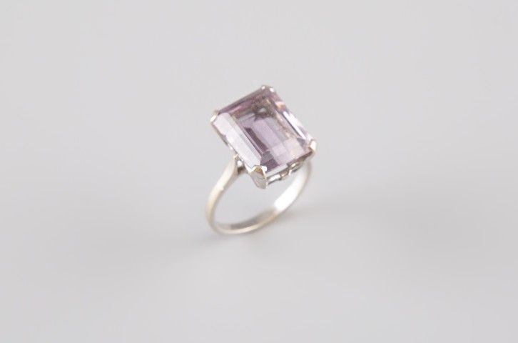 Estimation: 200/300 – Bague en or blanc 18K 750°/°°, poinçon tête d’aigle, sertie en son centre d’une améthyste de taille émeraude