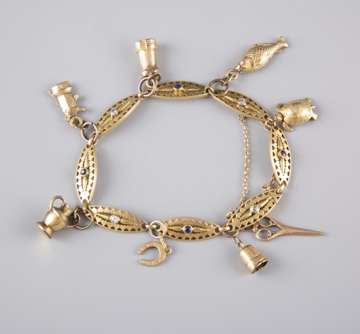 Estimation: 1500/1600 – Bracelet articulé en or jaune 18K 750°/°°, poinçon tête d’aigle, à maillons articulés sertie de brillants et saphirs avec ses huits breloques
