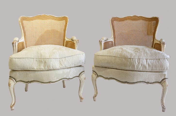 Estimation:150/200 DE TONGE. Paire de bergères en bois patiné hêtre. Les dossiers et les côtés cannés.