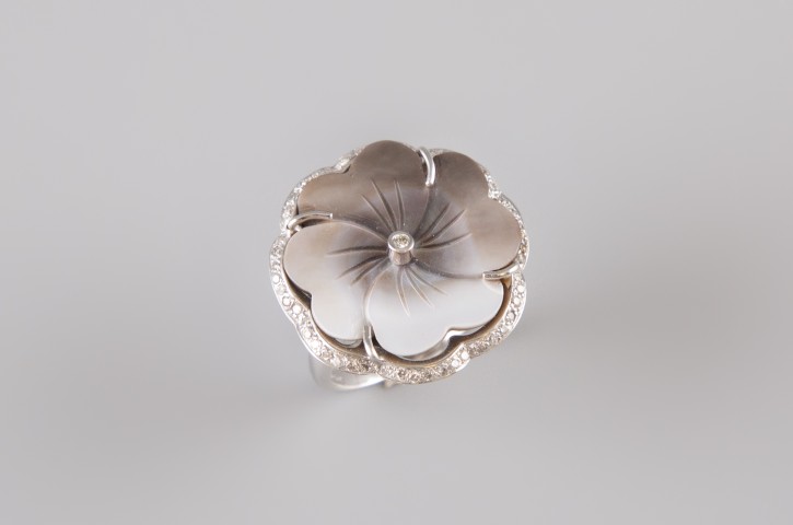 Estimation: 1450/1550 – Bague fleur en or blanc 18k 750°/°°, poinçon hibou et 18K, le plateau serti de nacre et d’un pavage de diamants taille brillants