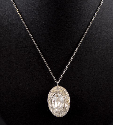 Estimation:30/50 SWAROVSKI. Collier en métal argenté et son pendentif ovale sertie d’un cristal entouré d’un pavage de cristaux. Ht 2,5cm.