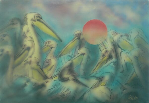 Estimation:150/200 GUIDO (1946-1995) « Le Concile des pélicans ». Huile sur toile signée et titrée au dos. 50x71cm.