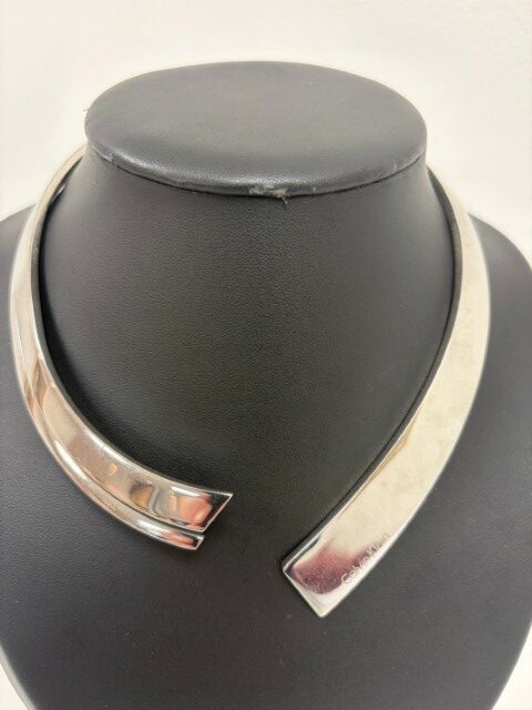 Estimation:40/50 CALVIN KLEIN. Collier tour de cou en acier articulé. Vendu avec sa boite, sa pochette de transport et son certificat d’authenticité de la maison Didier Guérin.