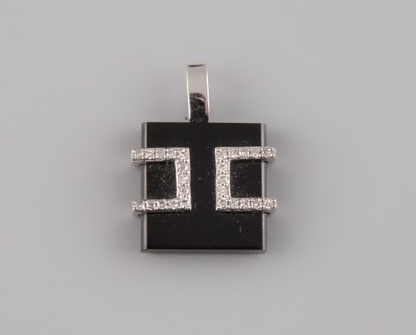 Estimation:300/400 Pendentif carré en jade noir et or blanc 18K 750°/°°, poinçon 750, sertie de diamants taille brillants. Ht 2cm. Poids brut 2,69g.