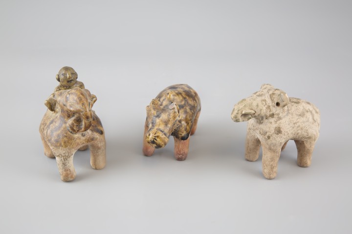 Estimation:150/200 THAILANDE, Sawankalok – XVe/XVIe siècle. Ensemble de trois statuettes, un éléphant, un buffle et un personnage sur un buffle en grès émaillé brun. (Accidents). H. 7 et 8 et 9 cm. Expert : Cabinet Portier, Paris.