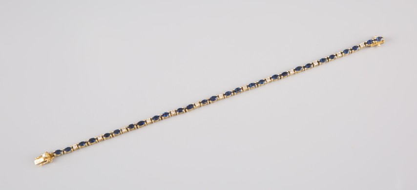 Estimation: 1400/1500 – Bracelet rivière en or jaune 18k 750°/°°, poinçon hibou, serti de 28 saphirs (au total environ 4cts) alternés de petits diamants taille brillants (au total environ 0,50ct)