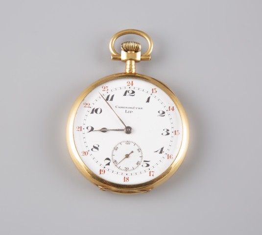 Estimation:800/1000 LIP. Montre de gousset en or jaune 18K 750°/°°, poinçon tête d’aigle, cadran fond blanc chiffres arabes en noir et rouge, chrono à 6h, double cuvette or. Mouvement non garantie. Vendu en l’état Poids brut 73,12g.